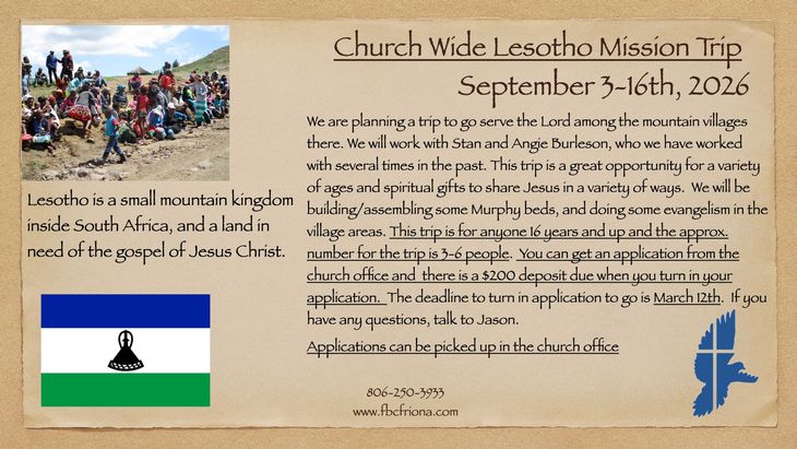 Come join us at FBC Friona! We are a warm and loving church family committed to the great commandment, the great commission, and the truth of God’s Word. At FBC we desire to see Christ glorified in our lives and seek to minister to people of all ages. We hope you can join us for worship this week! If you have any questions, or if we can help you in any way, please contact us.